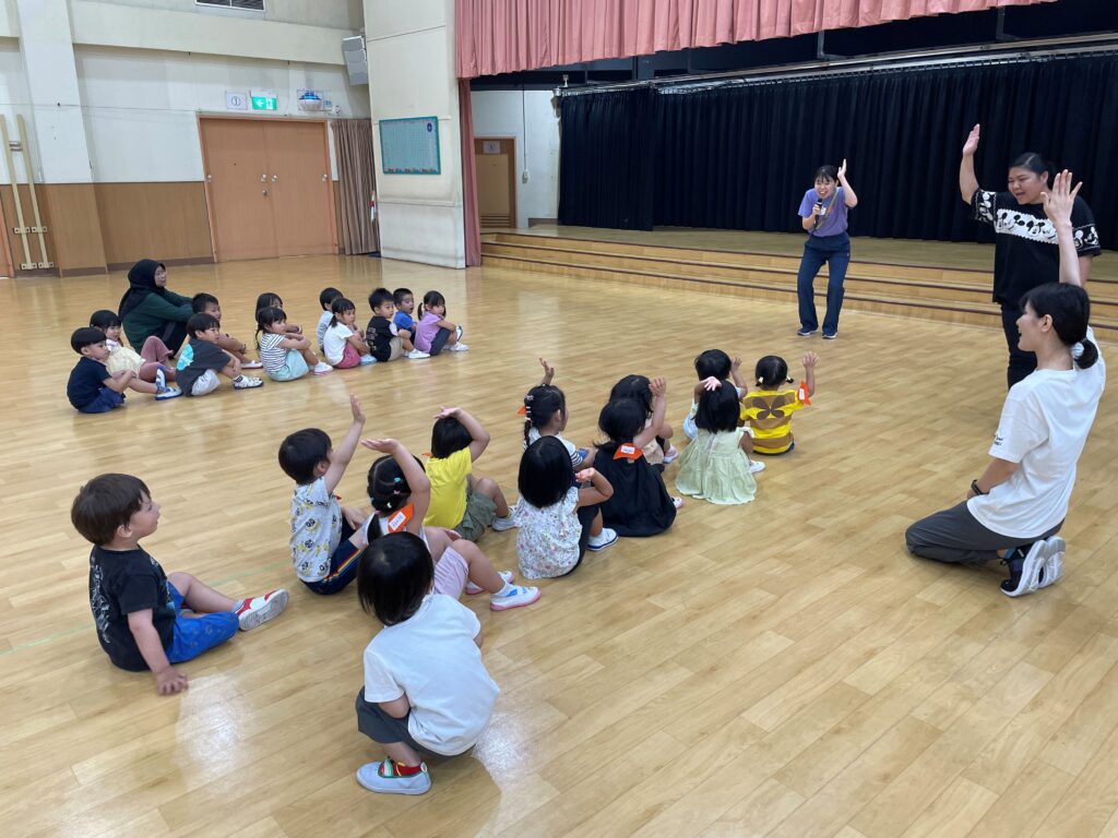 年少のみんながホールに集まり、今年度最初の体操の時間です。まずは「ラーメン体操」で心も体もほぐします。教室でも踊っているのでとても軽やかです。そして今日は初めての鉄棒!「つばめ」「豚の丸焼き」「前回り」と、先生からの説明のとおり早速挑戦してみました。先生に手伝ってもらいながら、みんなとても上手に出来て得意そうな顔がいっぱいになりました。